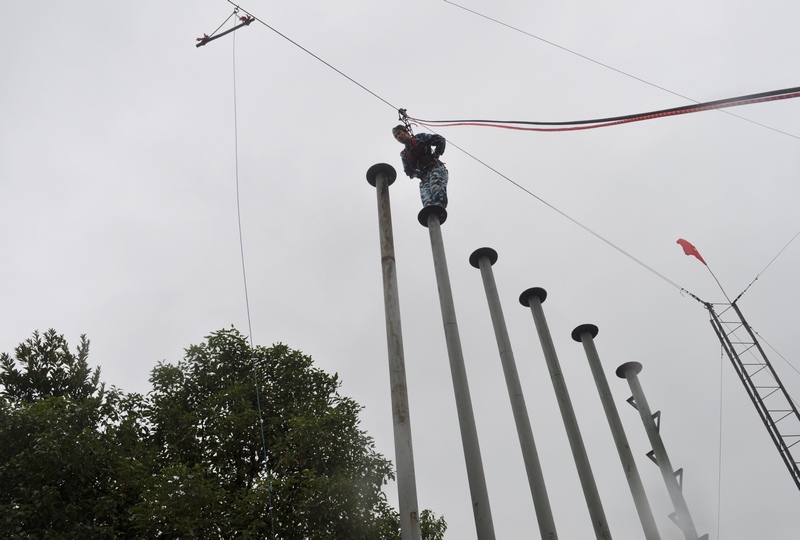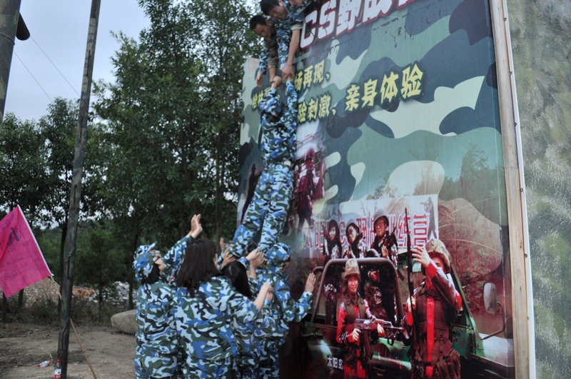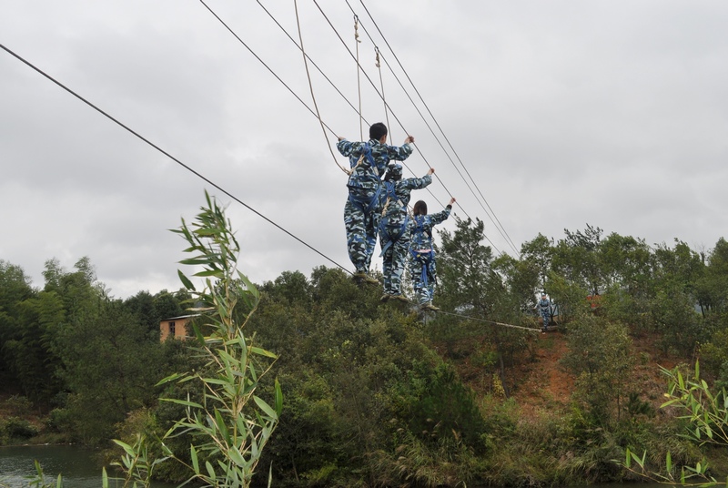 “云中漫步”是本次训练最为惊心动魄的一个项目,站在将近十米的铁杆之端,年青气盛、身体矫健的男队员都是战战兢兢,胆子小的队员以及女队员更是充满恐惧,甚至有的队员坚决表态不要参与该项目。队员小江自告奋勇,第一个完成了任务,给本项目开了先河,紧接着女队员小罗在全体队员的真诚鼓励下,第二个完成了任务,更是给大家带来了莫大的鼓舞和勇气。之后所有队员相继冲上了高杆,虽然有的胆小女队员几乎在杆子上哭泣掉泪,但是最终还是勇敢的迈出了脚步,全部队员胜利完成项目任务。这个过程,让大家克服了心理障碍,突破了自我极限,真正体会到“空中一小步,人生一大步”的真谛。