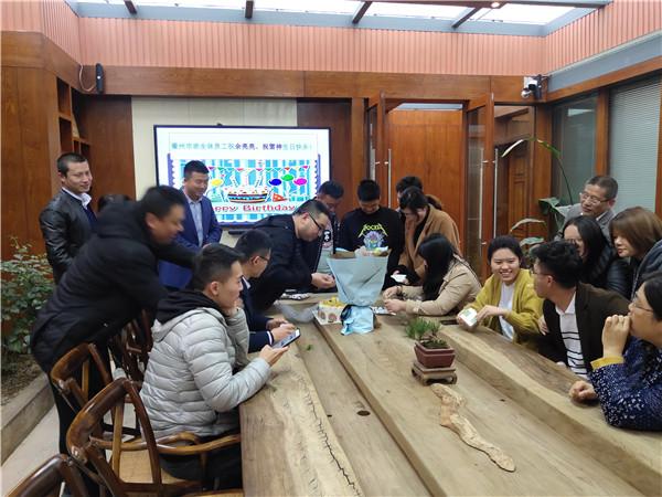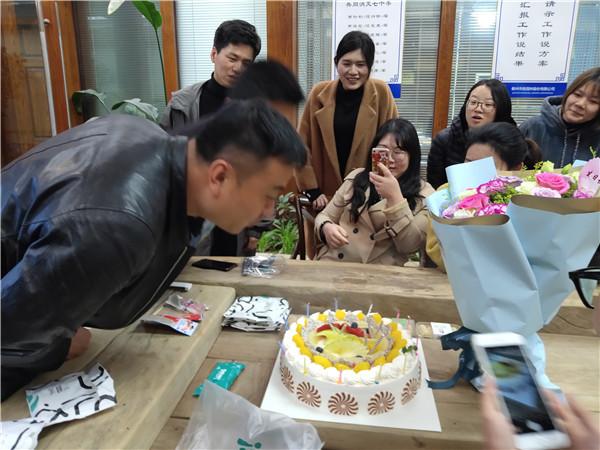 下午一点半,在公司工会主席蔡延祥主持下,公司全体员工开展了一场热热闹闹的庆生会,为余亮亮和祝雷神两位同事送上了自己的祝福。