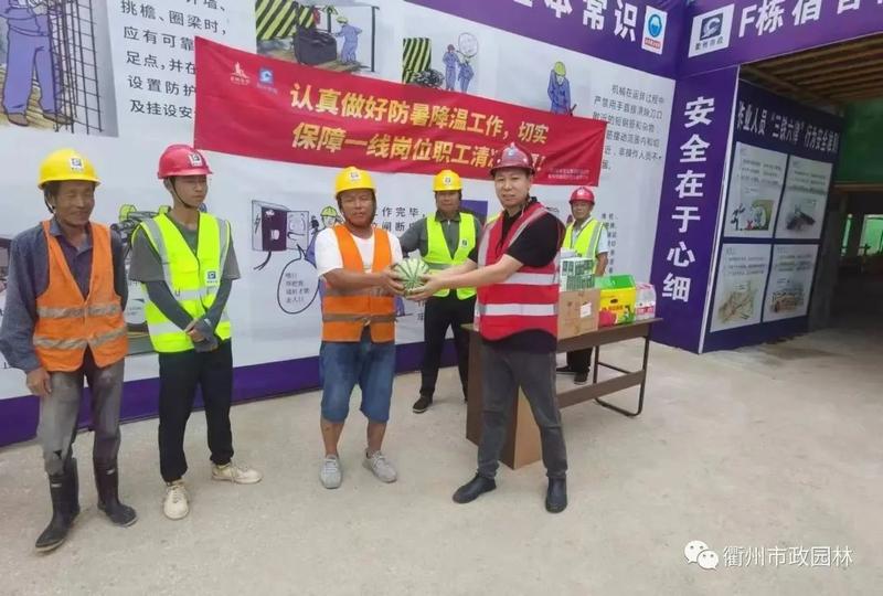 对酷暑天气还坚守一线的施工人员表示感谢,为他们送上了“高温慰问大礼包”,礼包内含有霍香正气水、人丹、清凉油、矿泉水、西瓜等防暑降温物品,并叮嘱项目部做到一、落实以“人民为中心”发展思想,坚持生命至上。二、推进科学防暑,合理安排工作时间,倡导延时错峰作业。三、敬惕热射病等高温疾病,建议职工随身携带防暑降温药品和饮用水,一旦身体不适,立即吃药就医。四、全力做好高温防暑工作,高度重视动火作业和高温用电安全,加大日常巡检力度,严防高温火灾风险。