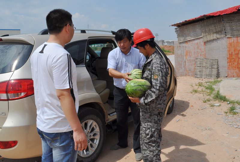 7月6日,党支部书记龚时辉、工会主席蔡延祥和工程部经理张金海带着水果、矿泉水和防暑药品走访市区7个在建项目,为各工地的项目部管理人员和农民工送上一份清凉,并叮嘱各工地负责人一定要做好高温季节作息时间的安排和防护措施的落实,确保施工人员的身体健康。