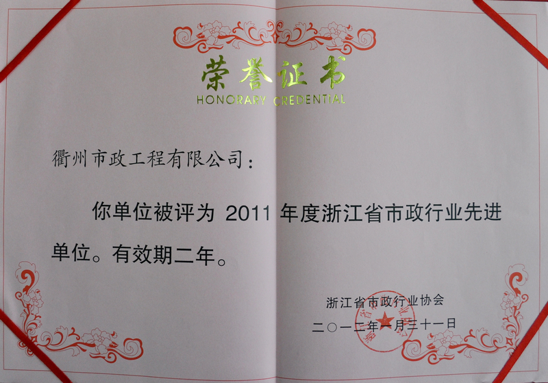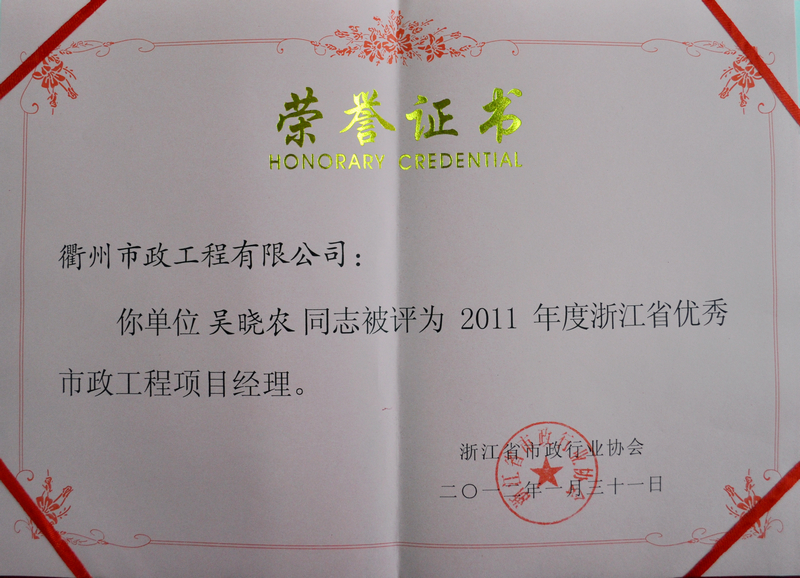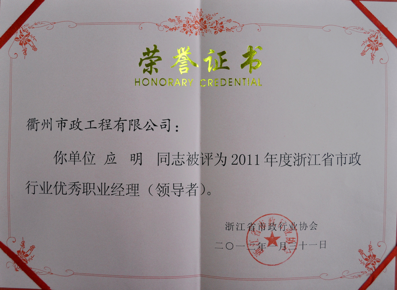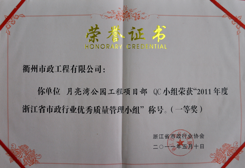 我公司除继续被评为浙江省市政行业先进单位以外,公司的QC成果《提高不规则冰梅面层石材铺装观感质量》荣获2011年度浙江省市政行业优秀质量管理小组一等奖,应明同志被评为2011年度浙江省市政行业优秀职业经理人,吴晓农同志被评为2011年度浙江省市政行业优秀项目经理。
