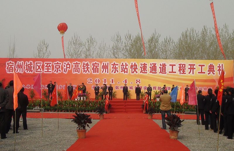 4月8日,京沪高铁宿州东站快速通道工程在施工现场举行盛大的开工典礼,宿州市政府、交通局、海事局等领导及施工单位代表、各界佳宾出席,公司董事长郑荣忠率项目部人员参加了开工典礼。