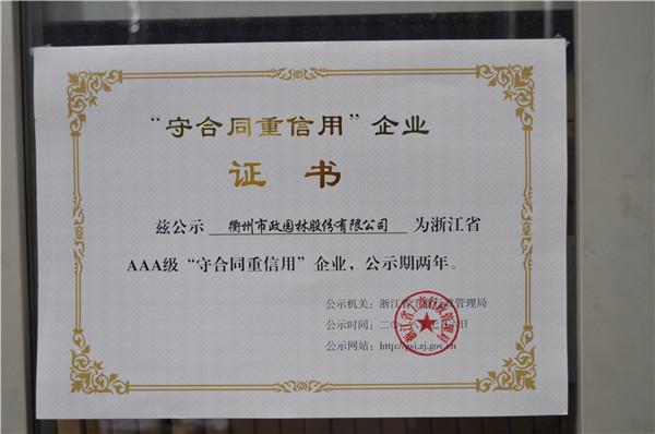 热烈祝贺我司荣获浙江省AAA级“守合同重信用”企业