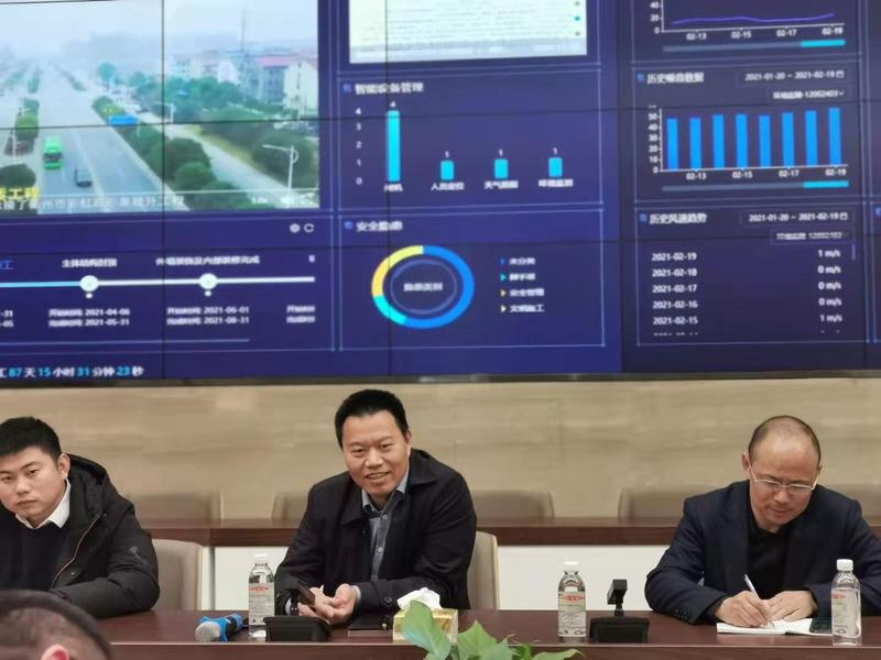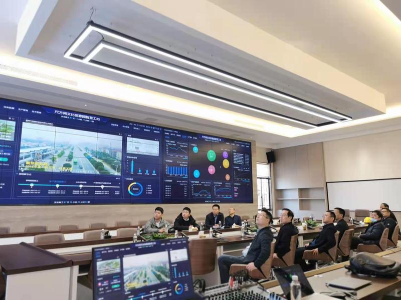 在郑荣忠董事长的陪同下,吴群一行先参观了公司园区尺方间项目,了解项目建设进度。随后在公司数控中心落座,与公司领导层展开座谈,深入了解公司发展情况。郑荣忠董事长详细介绍了建设数控中心的初衷,实现的功能及未来的发展方向,希望数控中心实现对建设项目全生命周期的精细化控制,节约成本、提高效率,将来在全行业推广。