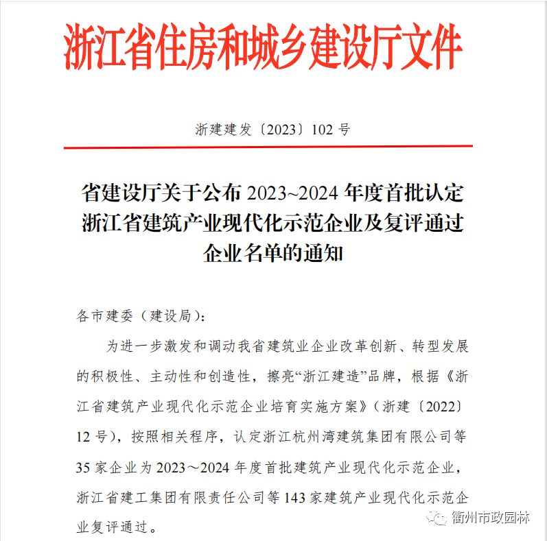 近日,省建设厅公布了2023-2024 年度首批认定浙江省建筑产业现代化示范企业及复评通过企业名单,我司获评省级建筑产业现代化示范企业荣誉。