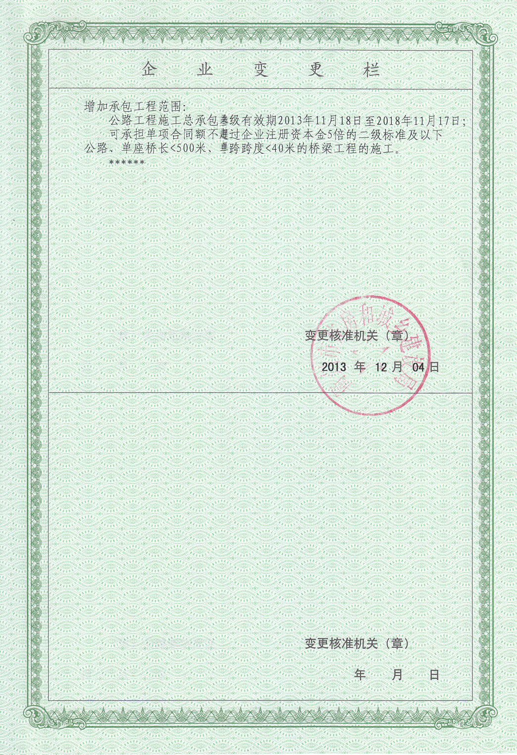 经衢州市交通局和住建局核准,公司新审批通过公路工程施工总承包三级增项资质,为公司开拓新的业务领域打好基础。