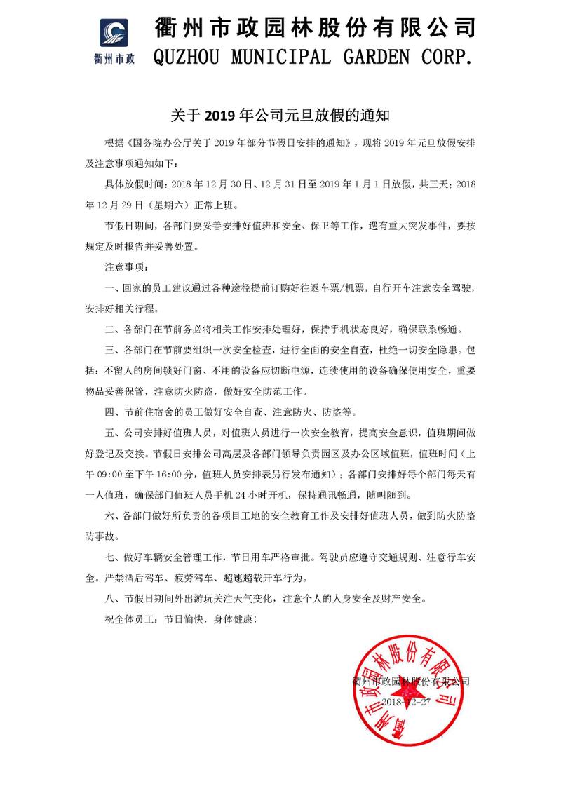 关于2019年公司元旦放假的通知