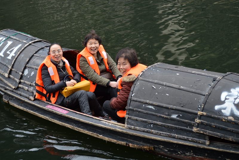 我们的第一站是绍兴东湖,映入眼帘的是清澈的湖水和远处连绵的群山。靠在石桥的栏杆上享受着迎面拂来的微风,简直要沉醉在这美丽的景色当中。听导游说,世界上仅有两处地方是用脚划船的,绍兴的乌篷船就是其中一处,远的去不了,绍兴的乌篷船也是非体验一把不可啊。东湖小而安静,坐在乌篷船上感觉离水很近,乌篷船滑过一处悬崖峭壁,仿佛已经融入了大自然当中。