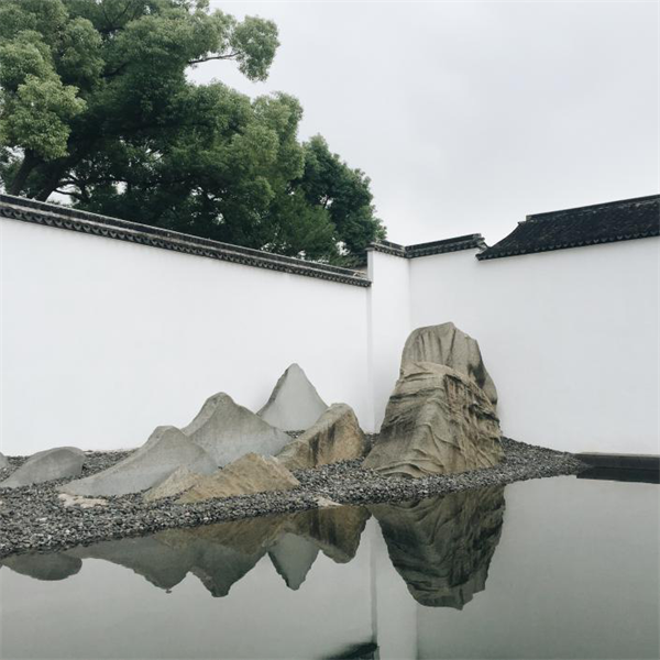 主庭院中,有满鹅卵石的池塘、片石假山、直曲小桥、八角凉亭、竹林,这是一座在古典园林元素基础上精心打造出的创意山水园,既不同于苏州传统园林,又不脱离中国人文气息和神韵。“以壁为纸,以石为绘”,别具一格的山水景观,呈现出清晰的轮廓和剪影效果。